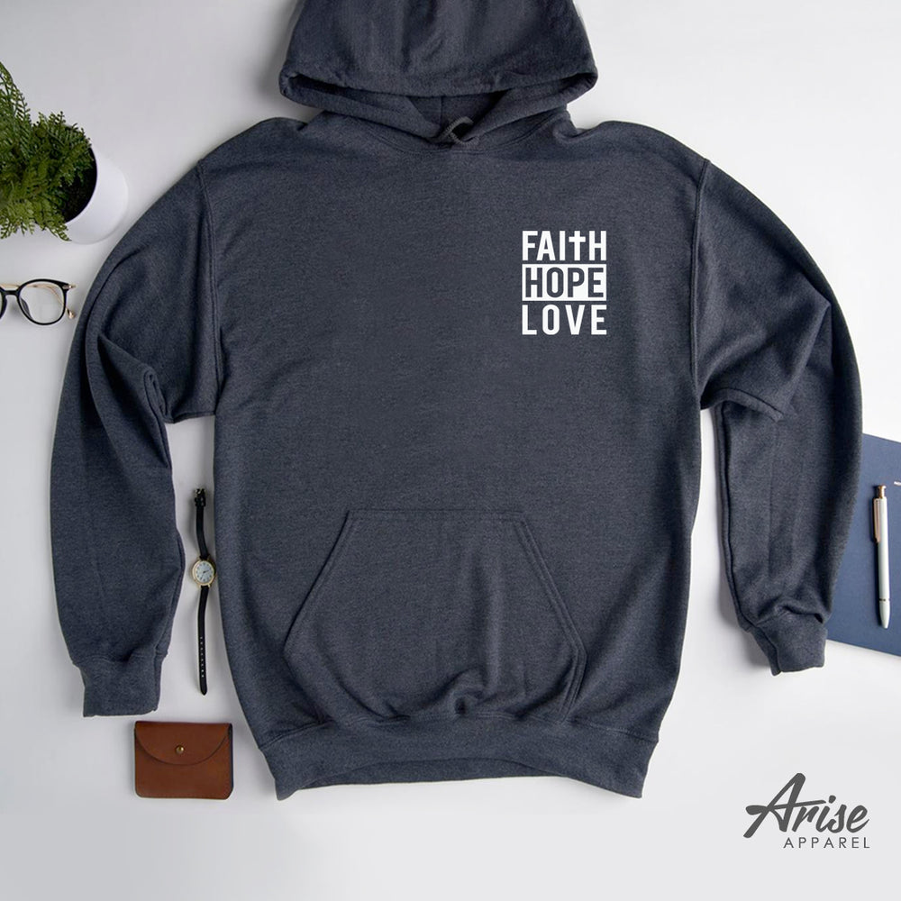 Three essentials in a Christian life. This minimalist design is based on 1 Corinthians 13 right after the "love" passage. "For now we see only a reflection as in a mirror; then we shall see face to face. Now I know in part; then I shall know fully, even as I am fully known. And now these three remain: FAITH, HOPE and LOVE." Wear it over your heart.