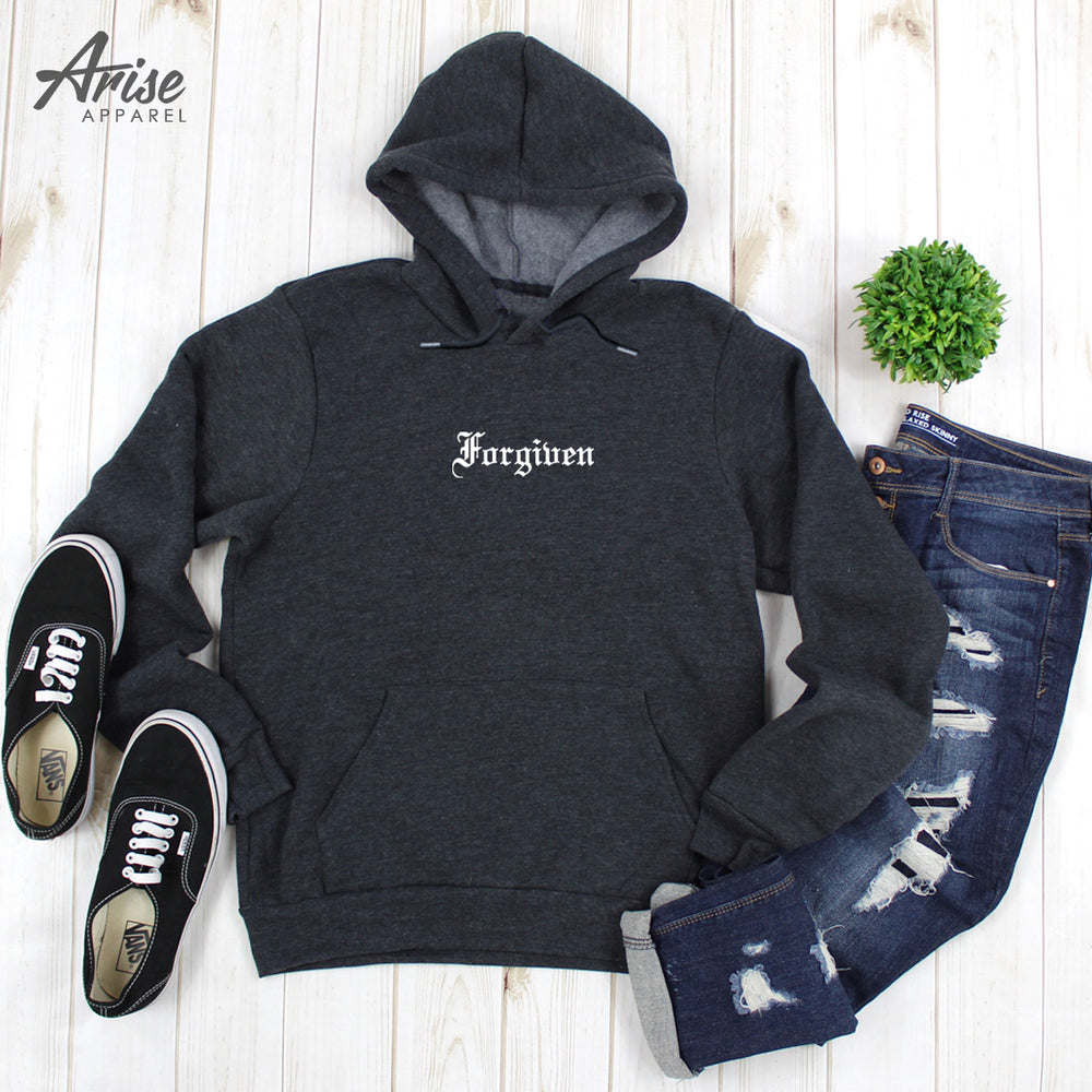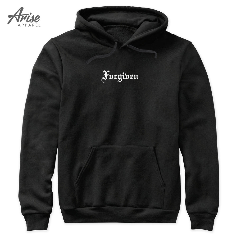 A minimalist Christian design that is clean, and simple. Old English font text "Forgiven" for small subtle fashion design. Look good without overly large graphics, small but you're still able to share you faith in Jesus and how you've been redeemed by the blood of Jesus Christ.