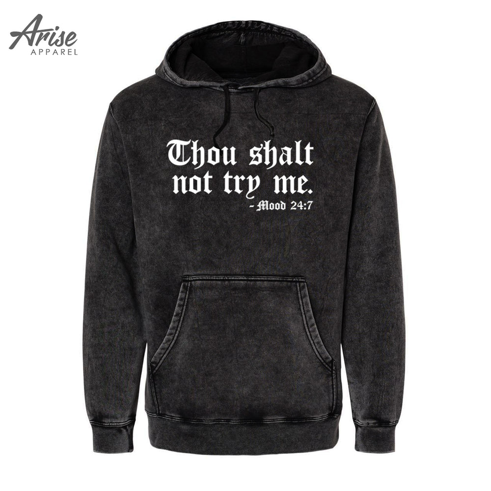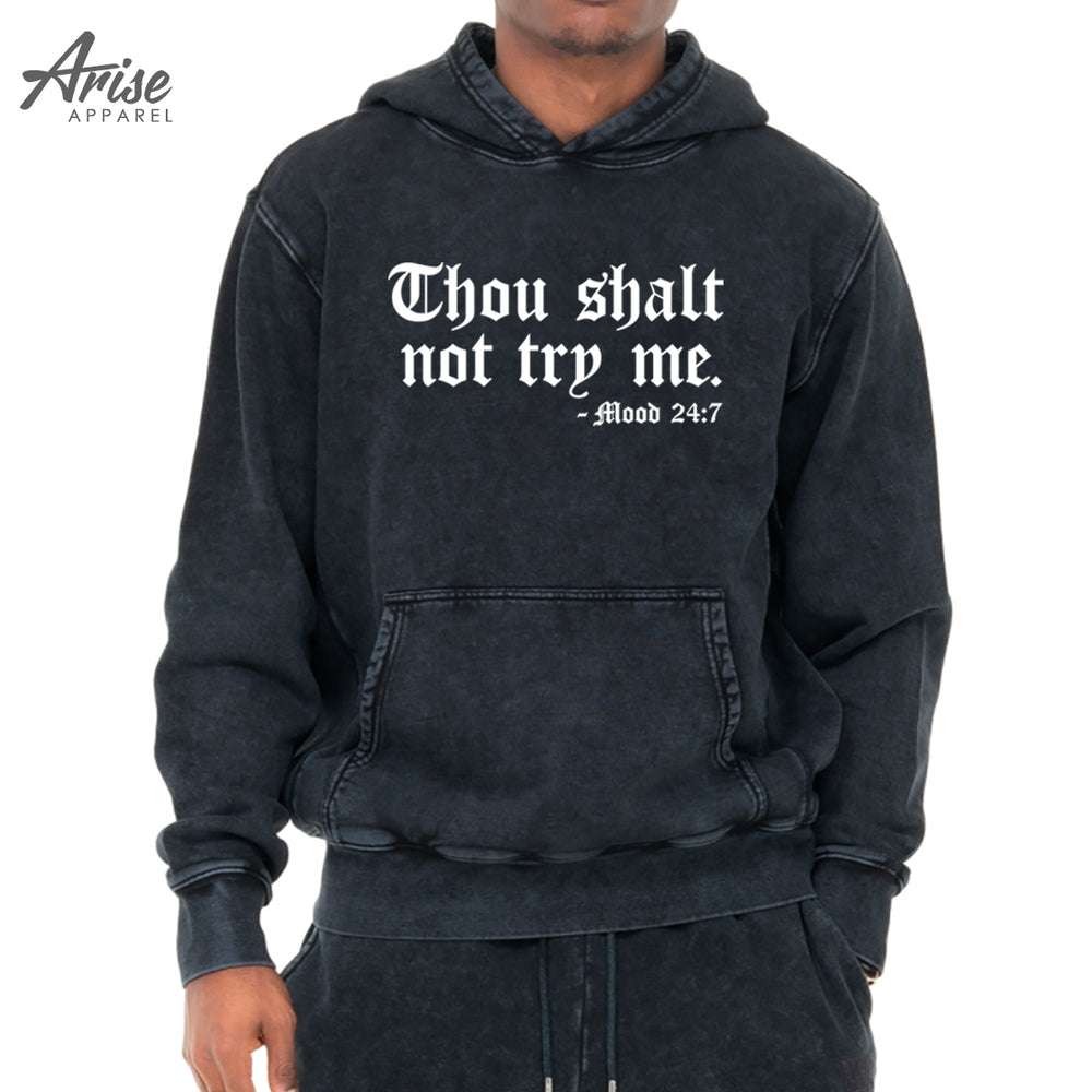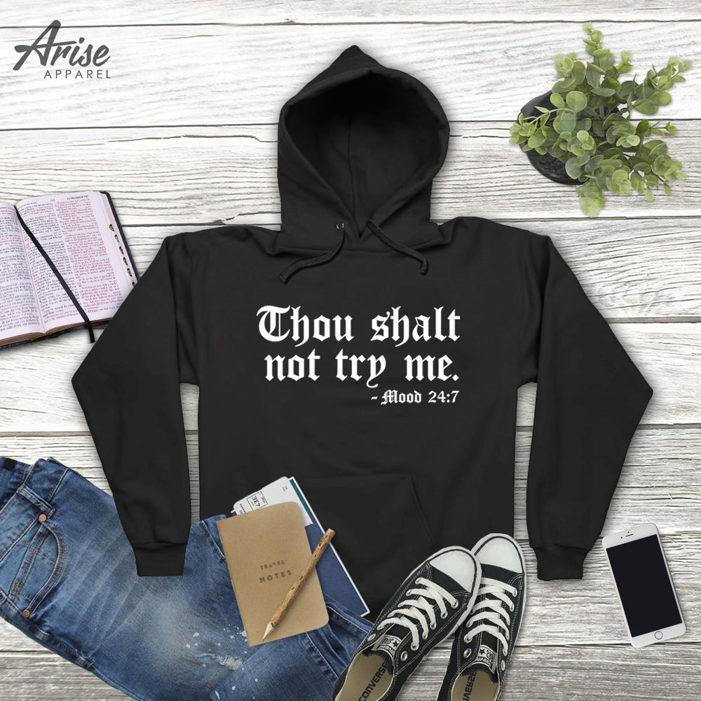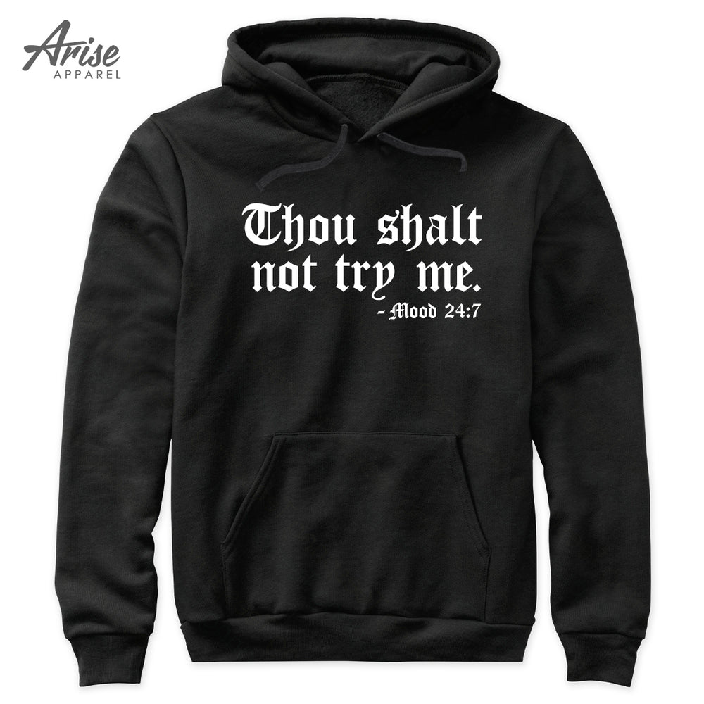 It is written, "Thou shalt not try me." in the life book of your Mood 24/7. You're Holy, but with just a little Hood! This is just a Christian humor design that is for fun. You can be a goody Christian, but there are people who really can test you! Let them try and see what happens. Reminder: love is kind, love is patience. But don'r cross the line!